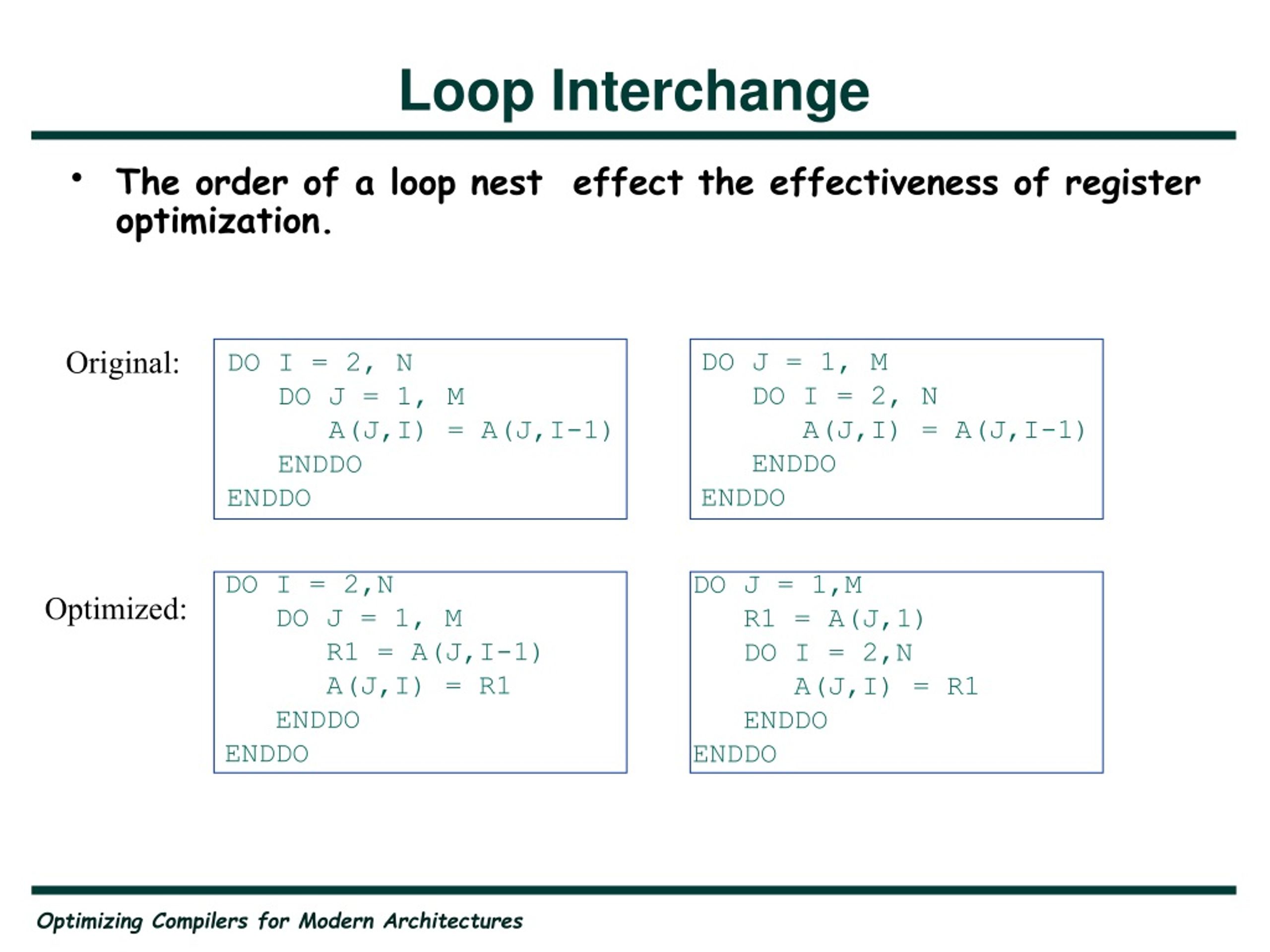 Loop Interchange • The order of a loop nest effect the effectiveness of register optimization. Original: DO J = 1, M DO I = 2, N A(J,I) = A(J,I-1) ENDDO ENDDO DO I = 2, N DO J = 1, M A(J,I) = A(J,I-1) ENDDO ENDDO DO I = 2,N DO J = 1, M R1 = A(J,I-1) A(J,I) = R1 ENDDO ENDDO DO J = 1,M R1 = A(J,1) DO I = 2,N A(J,I) = R1 ENDDO ENDDO Optimized: