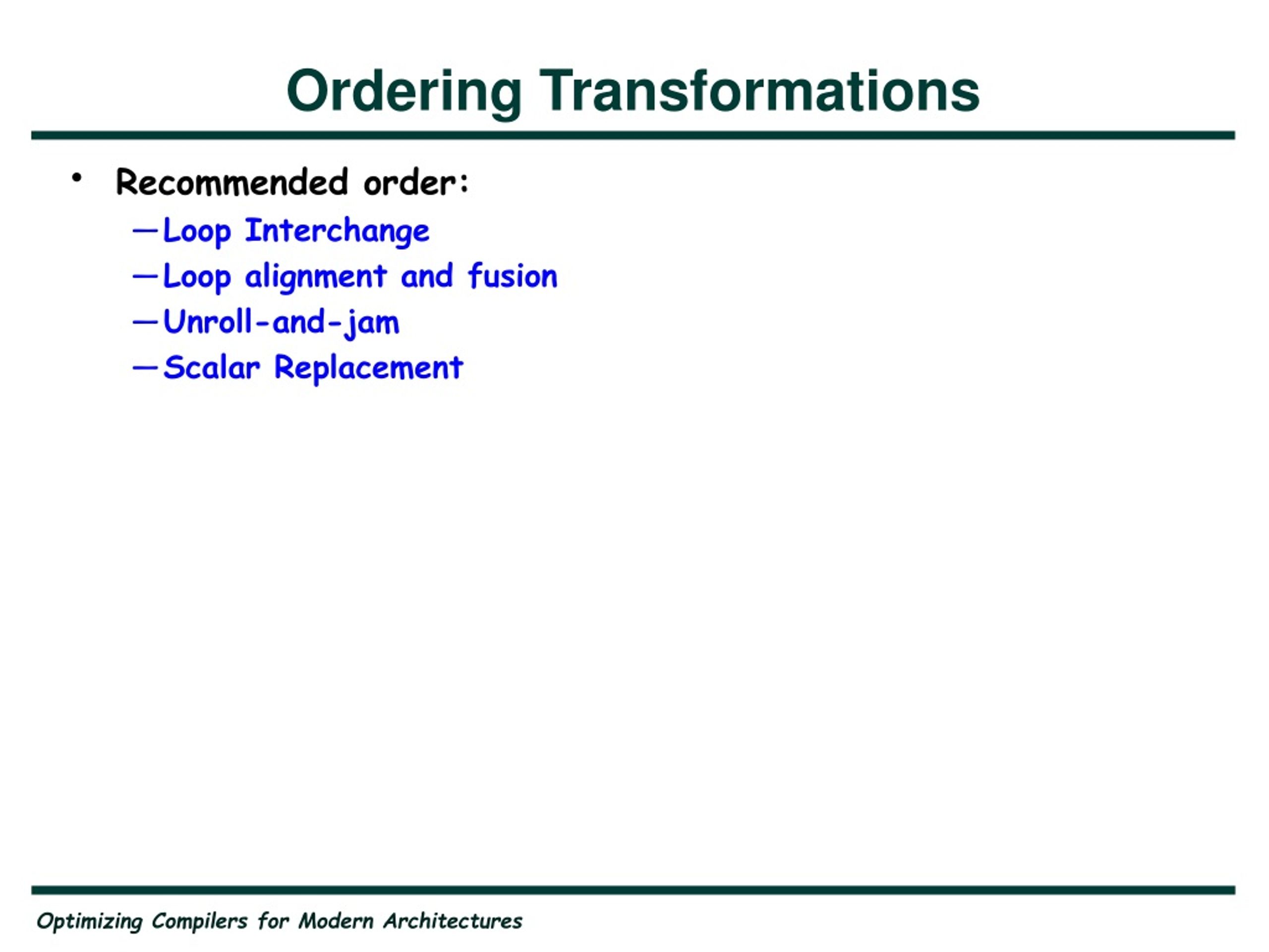 Ordering Transformations • Recommended order: • Loop Interchange • Loop alignment and fusion • Unroll-and-jam • Scalar Replacement