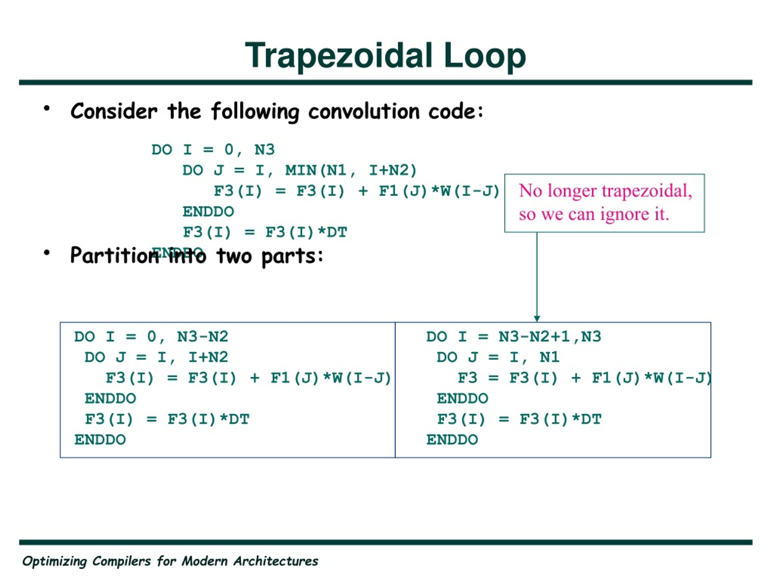 Trapezoidal Loop • Consider the following convolution code: • Partition into two parts: DO I = 0, N3 DO J = I, MIN(N1, I+N2) F3(I) = F3(I) + F1(J)*W(I-J) ENDDO F3(I) = F3(I)*DT ENDDO No longer trapezoidal, so we can ignore it. DO I = 0, N3-N2 DO J = I, I+N2 F3(I) = F3(I) + F1(J)*W(I-J) ENDDO F3(I) = F3(I)*DT ENDDO DO I = N3-N2+1,N3 DO J = I, N1 F3 = F3(I) + F1(J)*W(I-J) ENDDO F3(I) = F3(I)*DT ENDDO