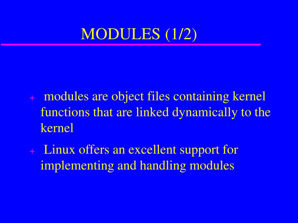 MODULES (1/2) • modules are object files containing kernel functions that are linked dynamically to the kernel • Linux offers an excellent support for implementing and handling modules