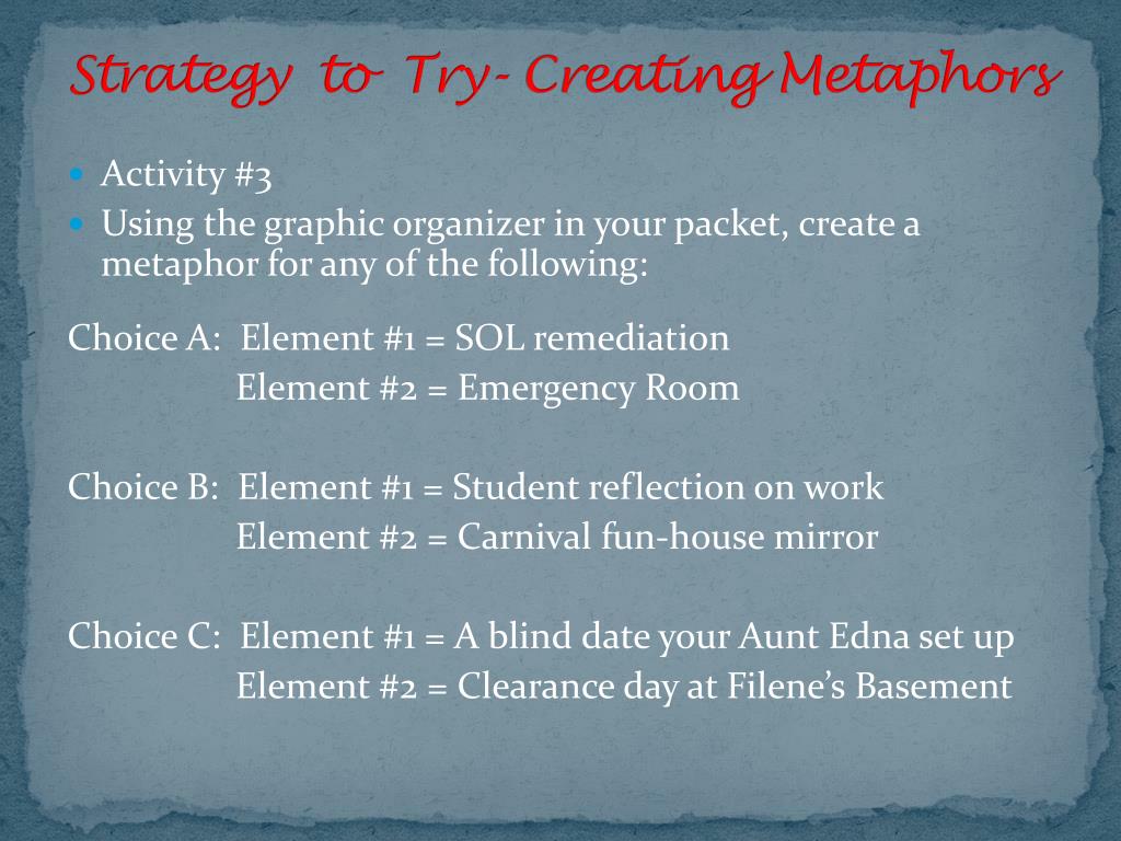 Strategy to Try- Creating Metaphors • Activity #3 • Using the graphic organizer in your packet, create a metaphor for any of the following: Choice A: Element #1 = SOL remediation Element #2 = Emergency Room Choice B: Element #1 = Student reflection on work Element #2 = Carnival fun-house mirror Choice C: Element #1 = A blind date your Aunt Edna set up Element #2 = Clearance day at Filene’s Basement
