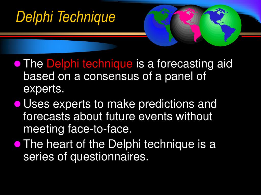 Delphi Technique • The Delphi technique is a forecasting aid based on a consensus of a panel of experts. • Uses experts to make predictions and forecasts about future events without meeting face-to-face. • The heart of the Delphi technique is a series of questionnaires.