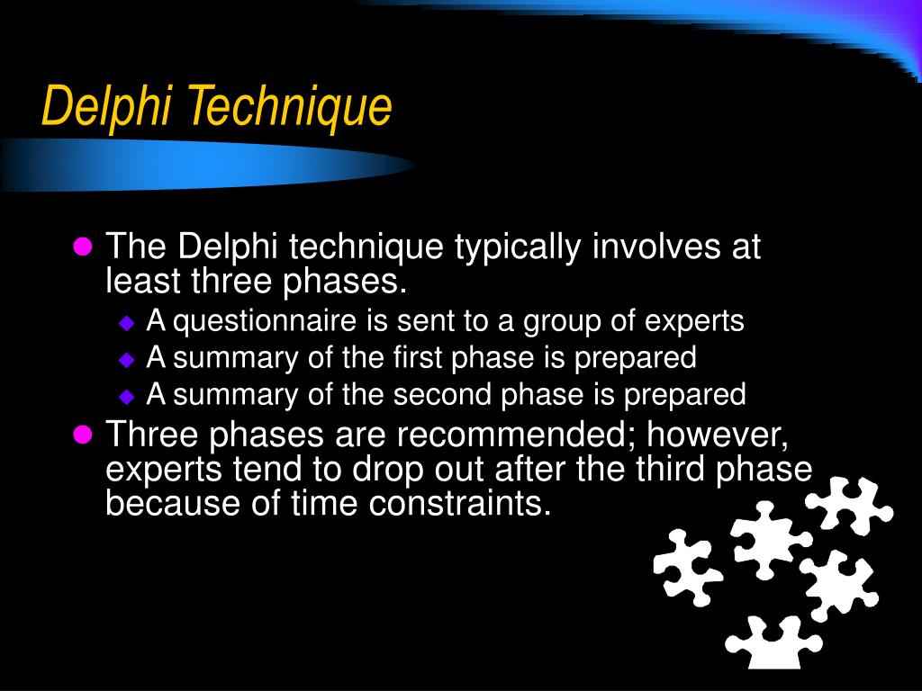 Delphi Technique • The Delphi technique typically involves at least three phases. • A questionnaire is sent to a group of experts • A summary of the first phase is prepared • A summary of the second phase is prepared • Three phases are recommended; however, experts tend to drop out after the third phase because of time constraints.