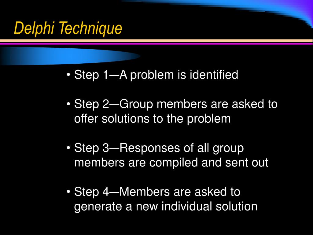 Delphi Technique • Step 1—A problem is identified • Step 2—Group members are asked to offer solutions to the problem • Step 3—Responses of all group members are compiled and sent out • Step 4—Members are asked to generate a new individual solution