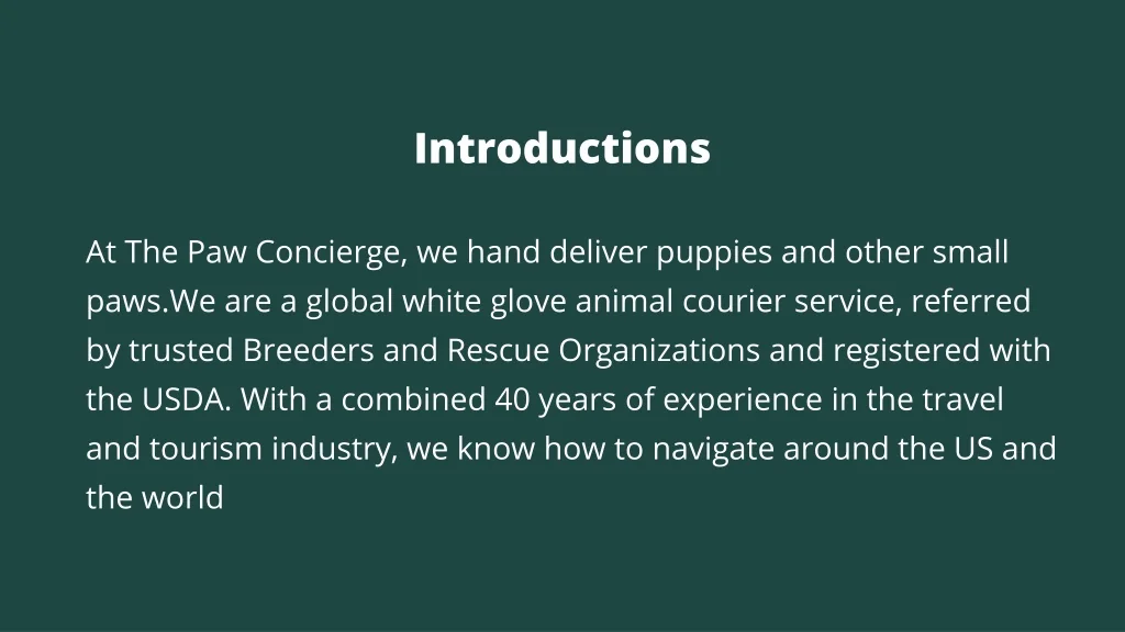 Introductions At The Paw Concierge, we hand deliver puppies and other small paws.We are a global white glove animal courier service, referred by trusted Breeders and Rescue Organizations and registered with the USDA. With a combined 40 years of experience in the travel and tourism industry, we know how to navigate around the US and the world