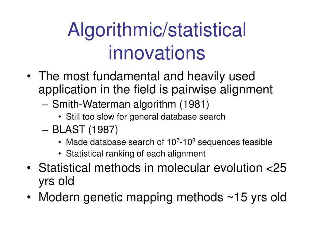 Algorithmic/statistical innovations • The most fundamental and heavily used application in the field is pairwise alignment • Smith-Waterman algorithm (1981) • Still too slow for general database search • BLAST (1987) • Made database search of 107-108 sequences feasible • Statistical ranking of each alignment • Statistical methods in molecular evolution <25 yrs old • Modern genetic mapping methods ~15 yrs old