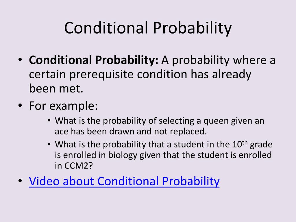 Conditional Probability • Conditional Probability: A probability where a certain prerequisite condition has already been met. • For example: • What is the probability of selecting a queen given an ace has been drawn and not replaced. • What is the probability that a student in the 10th grade is enrolled in biology given that the student is enrolled in CCM2? • Video about Conditional Probability
