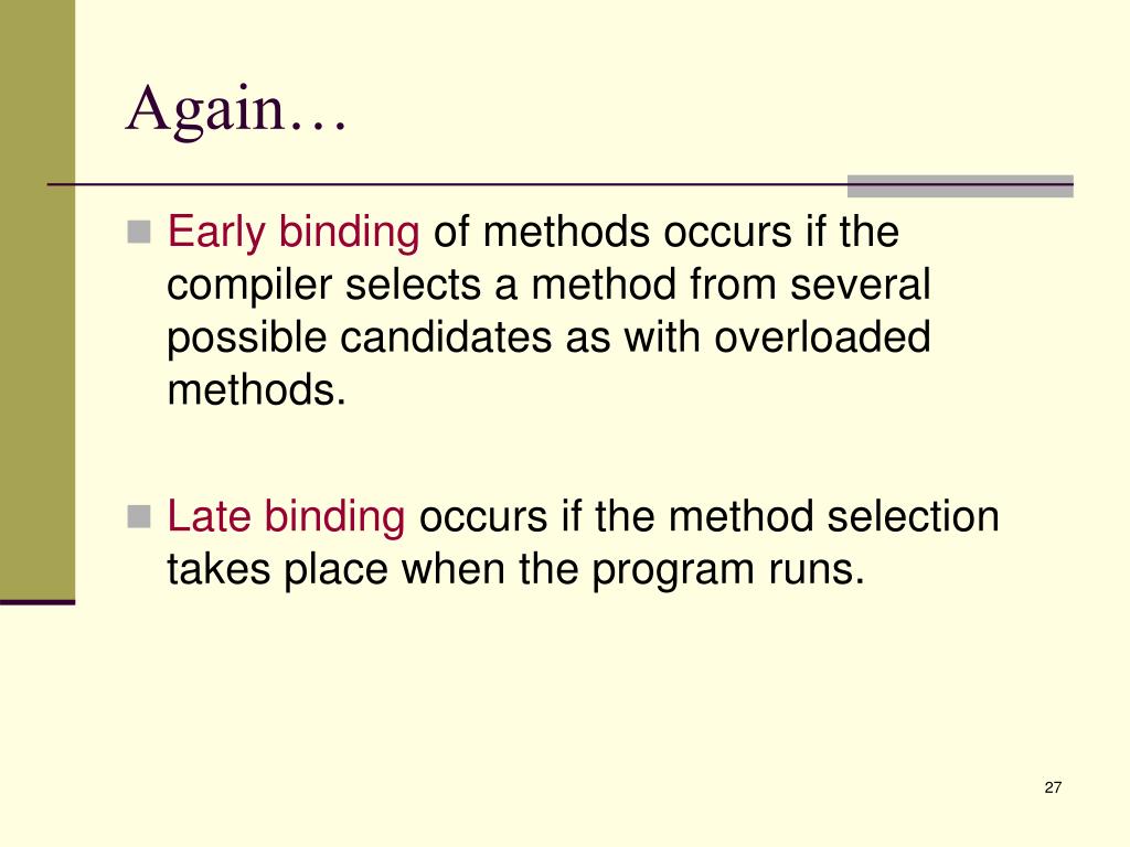 Again… • Early binding of methods occurs if the compiler selects a method from several possible candidates as with overloaded methods. • Late binding occurs if the method selection takes place when the program runs.