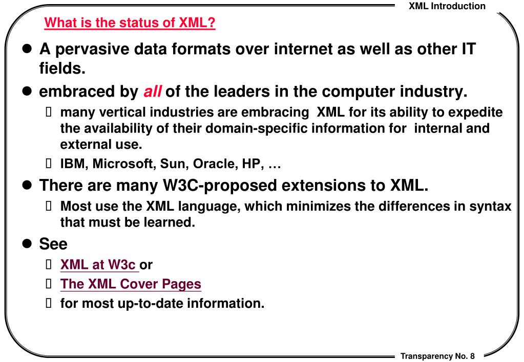 What is the status of XML? • A pervasive data formats over internet as well as other IT fields. • embraced by all of the leaders in the computer industry. • many vertical industries are embracing XML for its ability to expedite the availability of their domain-specific information for internal and external use. • IBM, Microsoft, Sun, Oracle, HP, … • There are many W3C-proposed extensions to XML. • Most use the XML language, which minimizes the differences in syntax that must be learned. • See • XML at W3c or • The XML Cover Pages • for most up-to-date information.