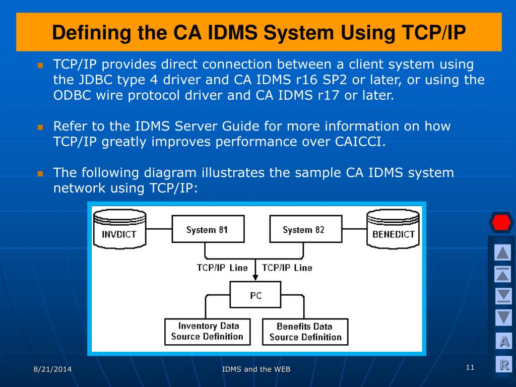 Defining the CA IDMS System Using TCP/IP • TCP/IP provides direct connection between a client system using the JDBC type 4 driver and CA IDMS r16 SP2 or later, or using the ODBC wire protocol driver and CA IDMS r17 or later. • Refer to the IDMS Server Guide for more information on how TCP/IP greatly improves performance over CAICCI. • The following diagram illustrates the sample CA IDMS system network using TCP/IP: IDMS and the WEB