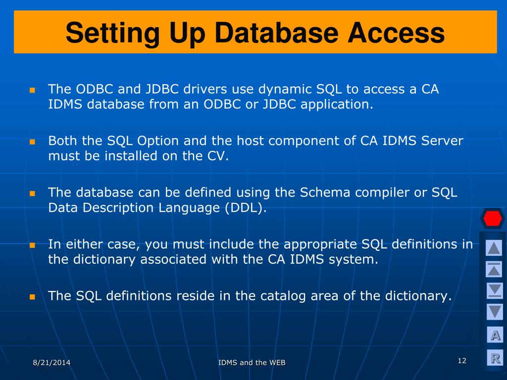 Setting Up Database Access • The ODBC and JDBC drivers use dynamic SQL to access a CA IDMS database from an ODBC or JDBC application. • Both the SQL Option and the host component of CA IDMS Server must be installed on the CV. • The database can be defined using the Schema compiler or SQL Data Description Language (DDL). • In either case, you must include the appropriate SQL definitions in the dictionary associated with the CA IDMS system. • The SQL definitions reside in the catalog area of the dictionary. IDMS and the WEB