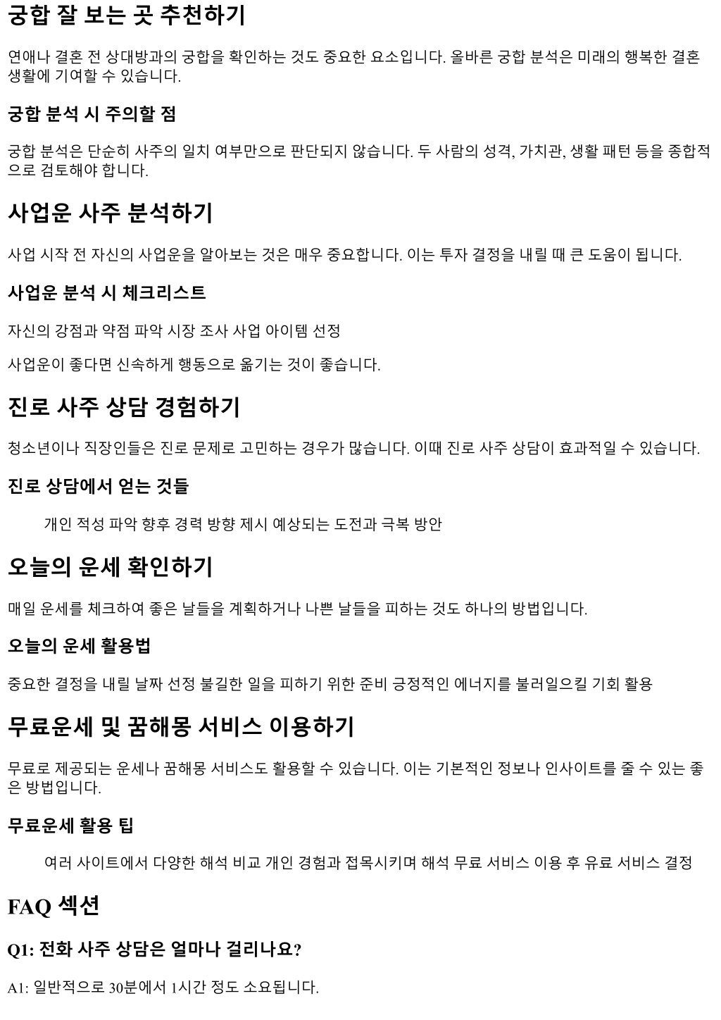 2. 궁합잘보는곳추천하기 연애나결혼전상대방과의궁합을확인하는것도중요한요소입니다. 올바른궁합분석은미래의행복한결혼 생활에기여할수있습니다. 궁합분석시주의할점 궁합분석은단순히사주의일치여부만으로판단되지않습니다. 두사람의성격, 가치관, 생활패턴등을종합적 으로검토해야합니다. 사업운사주분석하기 사업시작전자신의사업운을알아보는것은매우중요합니다. 이는투자결정을내릴때큰도움이됩니다. 사업운분석시체크리스트 자신의강점과약점파악시장조사사업아이템선정 사업운이좋다면신속하게행동으로옮기는것이좋습니다. 진로사주상담경험하기 청소년이나직장인들은진로문제로고민하는경우가많습니다. 이때진로사주상담이효과적일수있습니다. 진로상담에서얻는것들 개인적성파악향후경력방향제시예상되는도전과극복방안 오늘의운세확인하기 매일운세를체크하여좋은날들을계획하거나나쁜날들을피하는것도하나의방법입니다. 오늘의운세활용법 중요한결정을내릴날짜선정불길한일을피하기위한준비긍정적인에너지를불러일으킬기회활용 무료운세및꿈해몽서비스이용하기 무료로제공되는운세나꿈해몽서비스도활용할수있습니다. 이는기본적인정보나인사이트를줄수있는좋 은방법입니다. 무료운세활용팁 여러사이트에서다양한해석비교개인경험과접목시키며해석무료서비스이용후유료서비스결정 FAQ 섹션 Q1: 전화사주상담은얼마나걸리나요? A1: 일반적으로 30분에서 1시간정도소요됩니다.