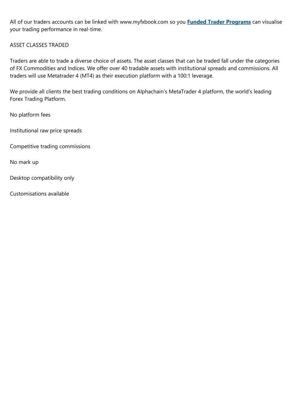 All of our traders accounts can be linked with www.myfxbook.com so you Funded Trader Programs can visualise your trading performance in real-time. ASSET CLASSES TRADED Traders are able to trade a diverse choice of assets. The asset classes that can be traded fall under the categories of FX Commodities and Indices. We offer over 40 tradable assets with institutional spreads and commissions. All traders will use Metatrader 4 (MT4) as their execution platform with a 100:1 leverage. We provide all clients the best trading conditions on Alphachain’s MetaTrader 4 platform, the world’s leading Forex Trading Platform. No platform fees Institutional raw price spreads Competitive trading commissions No mark up Desktop compatibility only Customisations available
