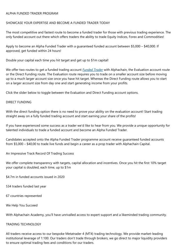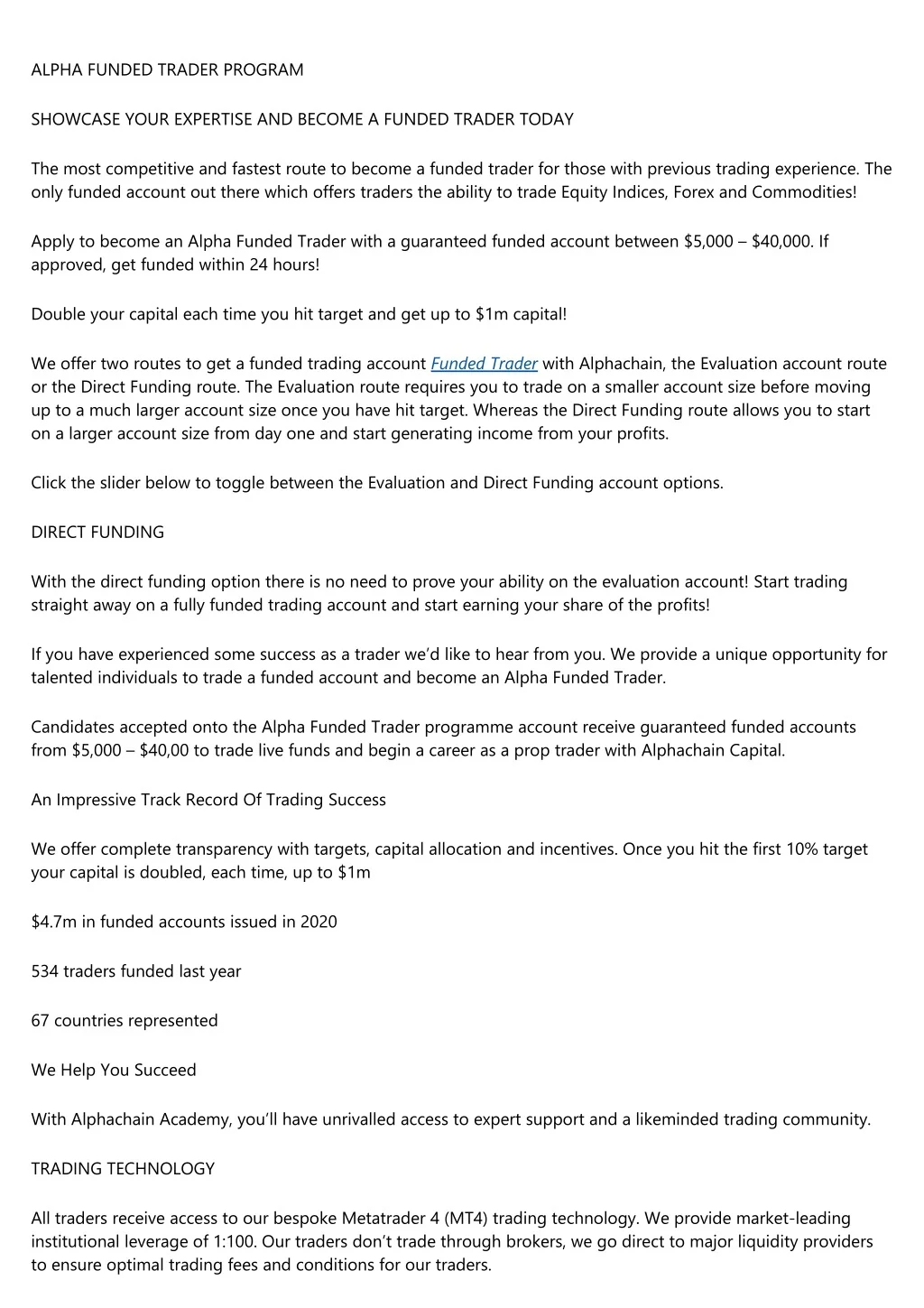 ALPHA FUNDED TRADER PROGRAM SHOWCASE YOUR EXPERTISE AND BECOME A FUNDED TRADER TODAY The most competitive and fastest route to become a funded trader for those with previous trading experience. The only funded account out there which offers traders the ability to trade Equity Indices, Forex and Commodities! Apply to become an Alpha Funded Trader with a guaranteed funded account between $5,000 – $40,000. If approved, get funded within 24 hours! Double your capital each time you hit target and get up to $1m capital! We offer two routes to get a funded trading account Funded Trader with Alphachain, the Evaluation account route or the Direct Funding route. The Evaluation route requires you to trade on a smaller account size before moving up to a much larger account size once you have hit target. Whereas the Direct Funding route allows you to start on a larger account size from day one and start generating income from your profits. Click the slider below to toggle between the Evaluation and Direct Funding account options. DIRECT FUNDING With the direct funding option there is no need to prove your ability on the evaluation account! Start trading straight away on a fully funded trading account and start earning your share of the profits! If you have experienced some success as a trader we’d like to hear from you. We provide a unique opportunity for talented individuals to trade a funded account and become an Alpha Funded Trader. Candidates accepted onto the Alpha Funded Trader programme account receive guaranteed funded accounts from $5,000 – $40,00 to trade live funds and begin a career as a prop trader with Alphachain Capital. An Impressive Track Record Of Trading Success We offer complete transparency with targets, capital allocation and incentives. Once you hit the first 10% target your capital is doubled, each time, up to $1m $4.7m in funded accounts issued in 2020 534 traders funded last year 67 countries represented We Help You Succeed With Alphachain Academy, you’ll have unrivalled access to expert support and a likeminded trading community. TRADING TECHNOLOGY All traders receive access to our bespoke Metatrader 4 (MT4) trading technology. We provide market-leading institutional leverage of 1:100. Our traders don’t trade through brokers, we go direct to major liquidity providers to ensure optimal trading fees and conditions for our traders.