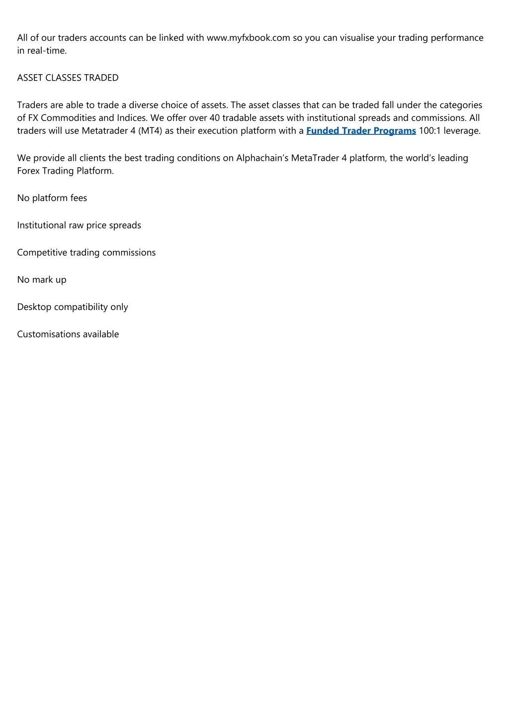 2. All of our traders accounts can be linked with www.myfxbook.com so you can visualise your trading performance in real-time. ASSET CLASSES TRADED Traders are able to trade a diverse choice of assets. The asset classes that can be traded fall under the categories of FX Commodities and Indices. We offer over 40 tradable assets with institutional spreads and commissions. All traders will use Metatrader 4 (MT4) as their execution platform with a Funded Trader Programs 100:1 leverage. We provide all clients the best trading conditions on Alphachain’s MetaTrader 4 platform, the world’s leading Forex Trading Platform. No platform fees Institutional raw price spreads Competitive trading commissions No mark up Desktop compatibility only Customisations available