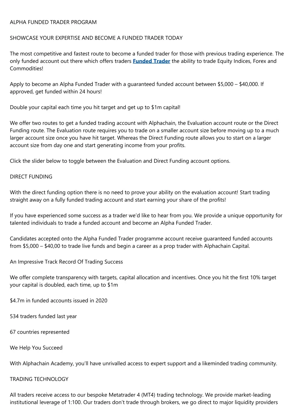 1. ALPHA FUNDED TRADER PROGRAM SHOWCASE YOUR EXPERTISE AND BECOME A FUNDED TRADER TODAY The most competitive and fastest route to become a funded trader for those with previous trading experience. The only funded account out there which offers traders Funded Trader the ability to trade Equity Indices, Forex and Commodities! Apply to become an Alpha Funded Trader with a guaranteed funded account between $5,000 – $40,000. If approved, get funded within 24 hours! Double your capital each time you hit target and get up to $1m capital! We offer two routes to get a funded trading account with Alphachain, the Evaluation account route or the Direct Funding route. The Evaluation route requires you to trade on a smaller account size before moving up to a much larger account size once you have hit target. Whereas the Direct Funding route allows you to start on a larger account size from day one and start generating income from your profits. Click the slider below to toggle between the Evaluation and Direct Funding account options. DIRECT FUNDING With the direct funding option there is no need to prove your ability on the evaluation account! Start trading straight away on a fully funded trading account and start earning your share of the profits! If you have experienced some success as a trader we’d like to hear from you. We provide a unique opportunity for talented individuals to trade a funded account and become an Alpha Funded Trader. Candidates accepted onto the Alpha Funded Trader programme account receive guaranteed funded accounts from $5,000 – $40,00 to trade live funds and begin a career as a prop trader with Alphachain Capital. An Impressive Track Record Of Trading Success We offer complete transparency with targets, capital allocation and incentives. Once you hit the first 10% target your capital is doubled, each time, up to $1m $4.7m in funded accounts issued in 2020 534 traders funded last year 67 countries represented We Help You Succeed With Alphachain Academy, you’ll have unrivalled access to expert support and a likeminded trading community. TRADING TECHNOLOGY All traders receive access to our bespoke Metatrader 4 (MT4) trading technology. We provide market-leading institutional leverage of 1:100. Our traders don’t trade through brokers, we go direct to major liquidity providers