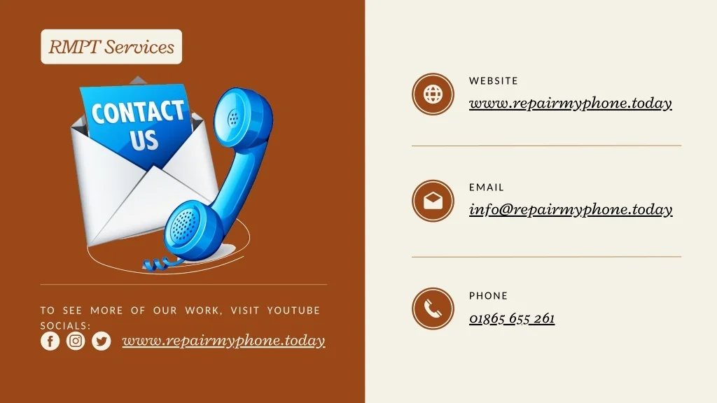 RMPT Services WEBSITE www.repairmyphone.today EMAIL info@repairmyphone.today PHONE 01865 655 261 TO SEE MORE OF OUR WORK, VISIT YOUTUBE SOCIALS: www.repairmyphone.today