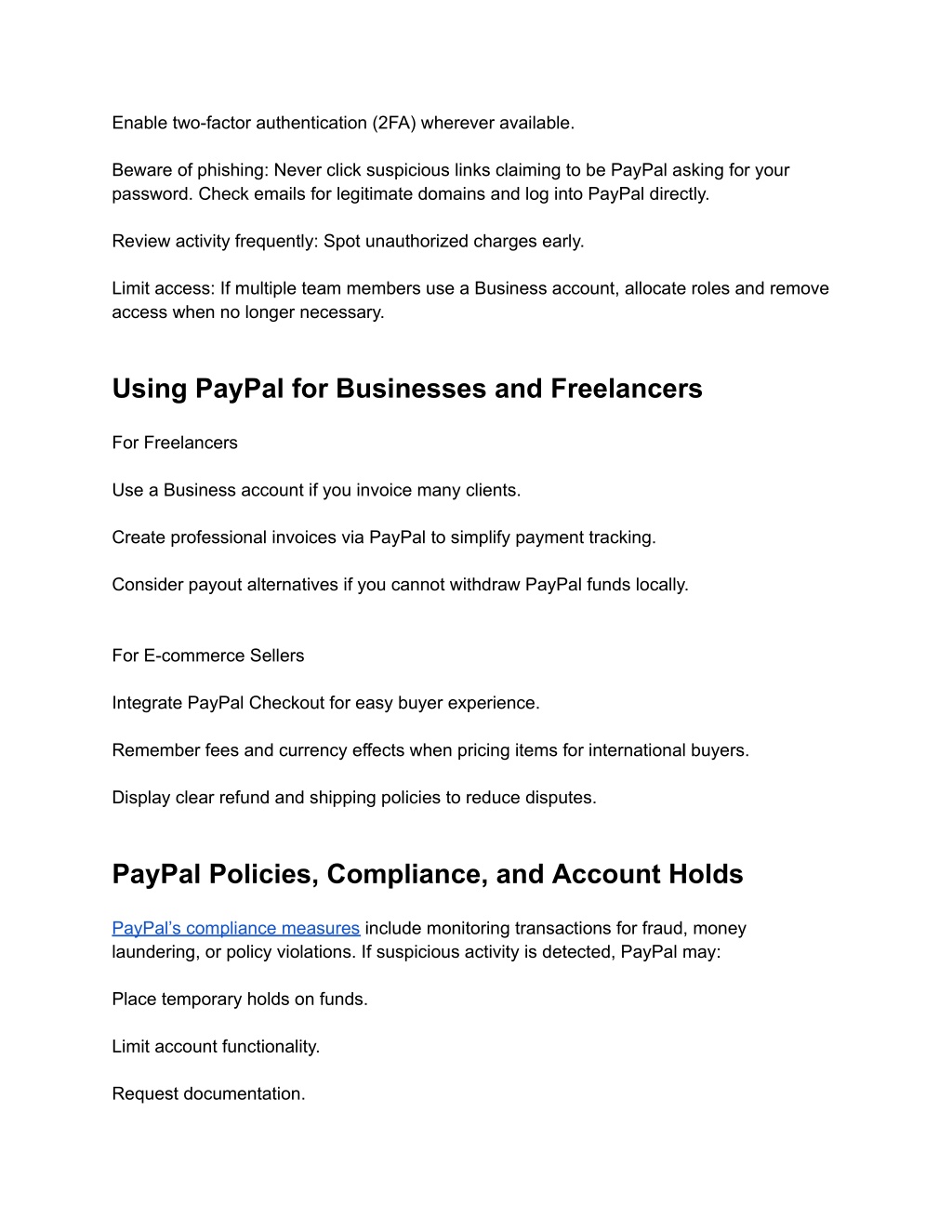 Enable two-factor authentication (2FA) wherever available. Beware of phishing: Never click suspicious links claiming to be PayPal asking for your password. Check emails for legitimate domains and log into PayPal directly. Review activity frequently: Spot unauthorized charges early. Limit access: If multiple team members use a Business account, allocate roles and remove access when no longer necessary. Using PayPal for Businesses and Freelancers For Freelancers Use a Business account if you invoice many clients. Create professional invoices via PayPal to simplify payment tracking. Consider payout alternatives if you cannot withdraw PayPal funds locally. For E-commerce Sellers Integrate PayPal Checkout for easy buyer experience. Remember fees and currency effects when pricing items for international buyers. Display clear refund and shipping policies to reduce disputes. PayPal Policies, Compliance, and Account Holds PayPal’s compliance measures include monitoring transactions for fraud, money laundering, or policy violations. If suspicious activity is detected, PayPal may: Place temporary holds on funds. Limit account functionality. Request documentation.