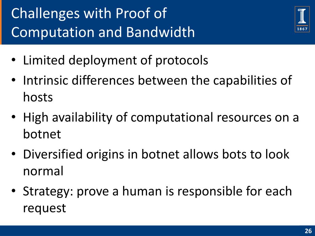 Challenges with Proof of Computation and Bandwidth • Limited deployment of protocols • Intrinsic differences between the capabilities of hosts • High availability of computational resources on a botnet • Diversified origins in botnet allows bots to look normal • Strategy: prove a human is responsible for each request