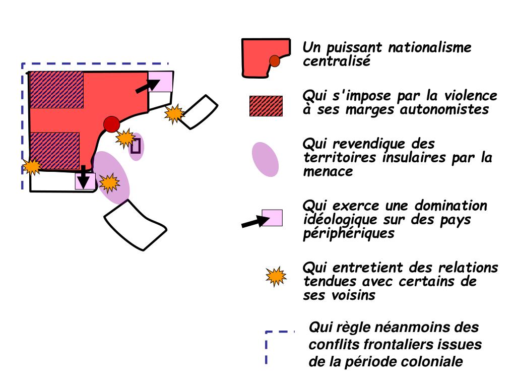 Un puissant nationalisme centralisé Qui s'impose par la violence à ses marges autonomistes Qui revendique des territoires insulaires par la menace Qui exerce une domination idéologique sur des pays périphériques Qui entretient des relations tendues avec certains de ses voisins Qui règle néanmoins des conflits frontaliers issues de la période coloniale