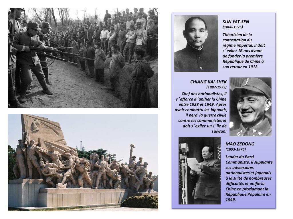 SUN YAT-SEN (1866-1925) Théoricien de la contestation du régime impérial, il doit s’exiler 16 ans avant de fonder la première République de Chine à son retour en 1912. CHIANG KAI-SHEK (1887-1975) Chef des nationalistes, il s’efforce d’unifier la Chine entre 1928 et 1949. Après avoir combattu les Japonais, il perd la guerre civile contre les communistes et doit s’exiler sur l’île de Taïwan. MAO ZEDONG (1893-1976) Leader du Parti Communiste, il supplante ses adversaires nationalistes et japonais à la suite de nombreuses difficultés et unifie la Chine en proclamant la République Populaire en 1949.