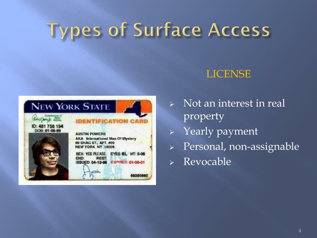Types of Surface Access LICENSE • Not an interest in real property • Yearly payment • Personal, non-assignable • Revocable