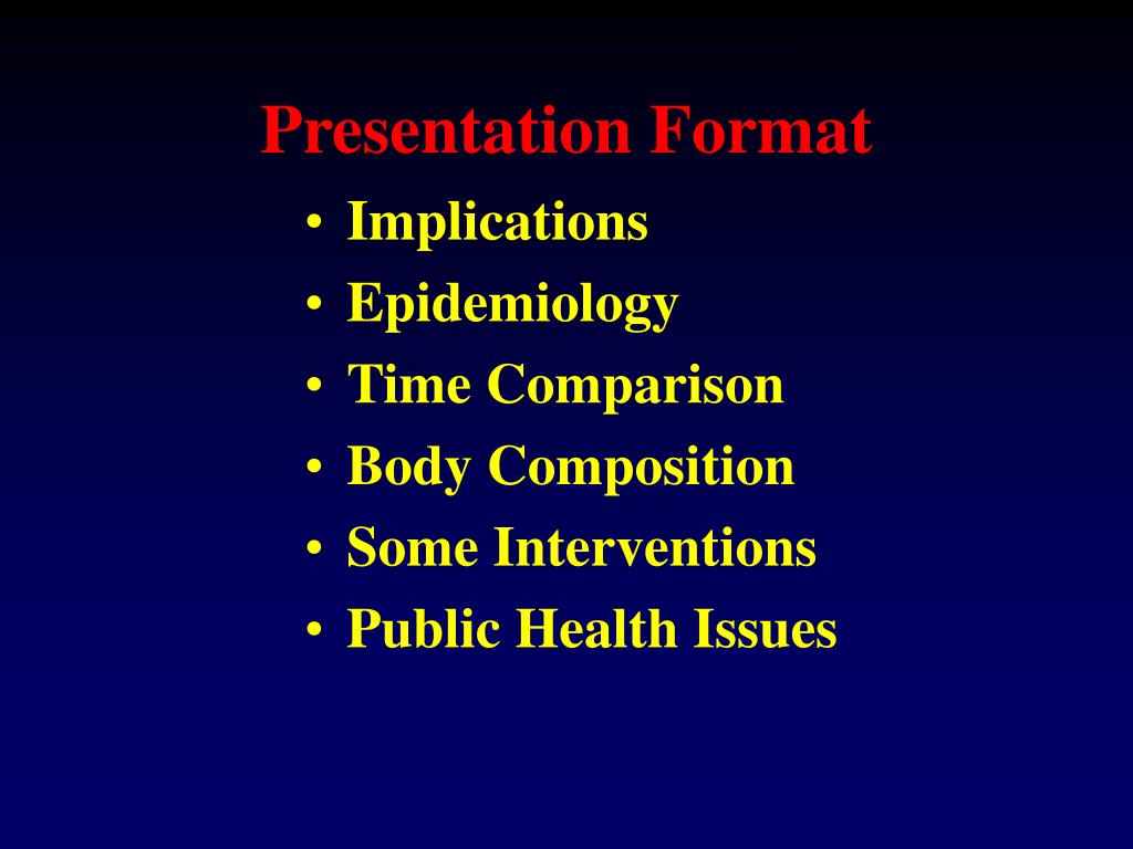 Presentation Format • Implications • Epidemiology • Time Comparison • Body Composition • Some Interventions • Public Health Issues