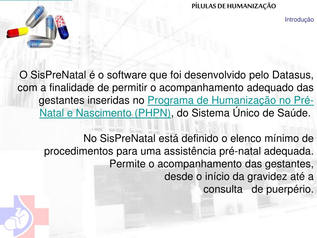 PÍLULAS DE HUMANIZAÇÃO Introdução O SisPreNatal é o software que foi desenvolvido pelo Datasus, com a finalidade de permitir o acompanhamento adequado das gestantes inseridas no Programa de Humanização no Pré-Natal e Nascimento (PHPN), do Sistema Único de Saúde. No SisPreNatal está definido o elenco mínimo de procedimentos para uma assistência pré-natal adequada. Permite o acompanhamento das gestantes, desde o início da gravidez até a consulta de puerpério.