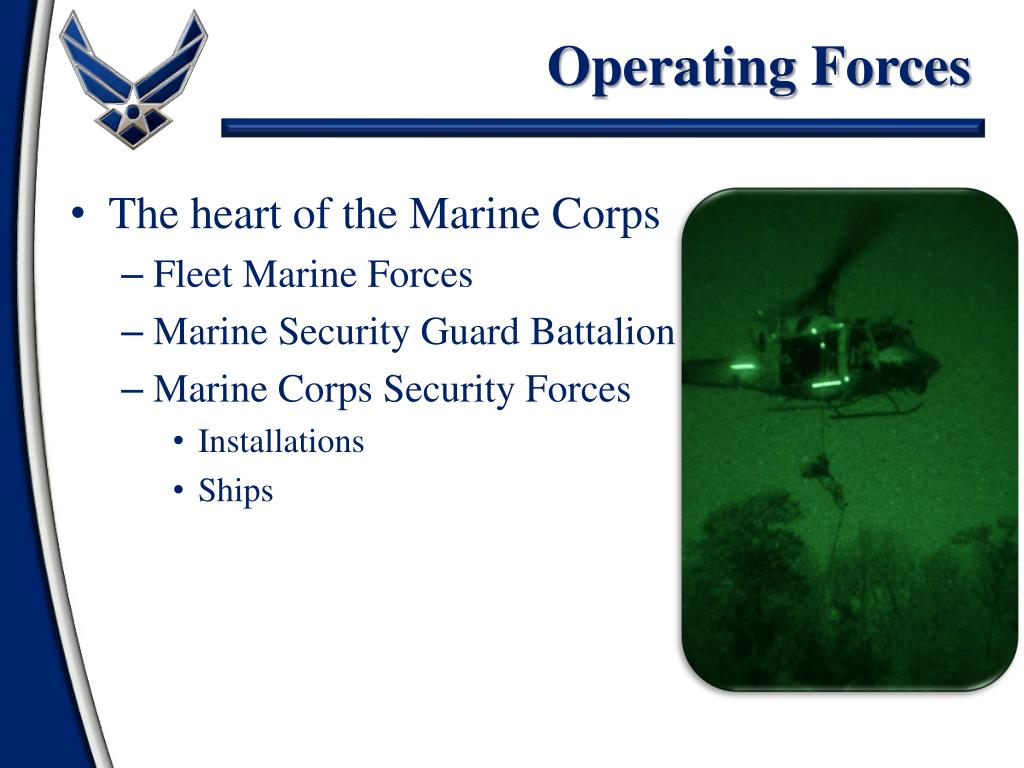Operating Forces • The heart of the Marine Corps • Fleet Marine Forces • Marine Security Guard Battalion • Marine Corps Security Forces • Installations • Ships