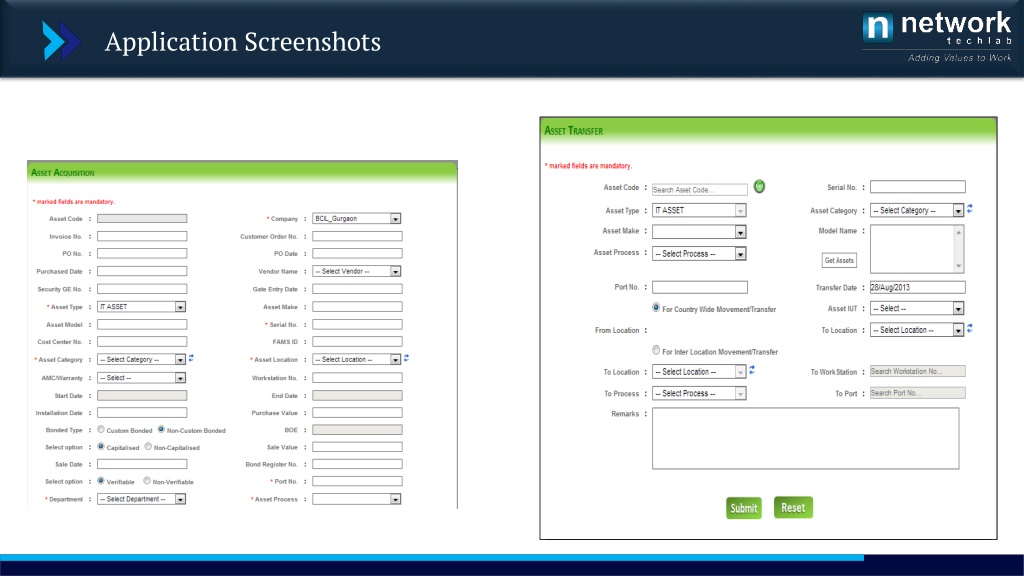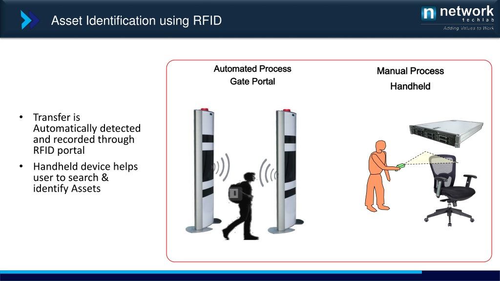 9. Asset Identification using RFID Automated Process Gate Portal Manual Process Handheld Transfer is Automatically detected and recorded through RFID portal Handheld device helps user to search & identify Assets
