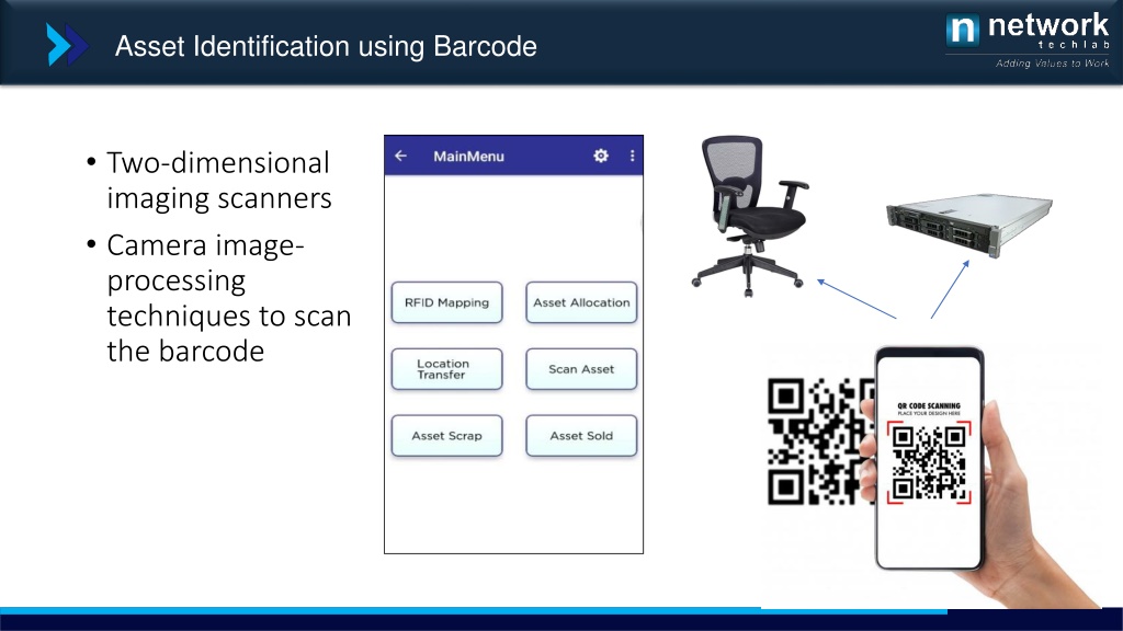 8. Asset Identification using Barcode • Two-dimensional imaging scanners • Camera image-processing techniques to scan the barcode