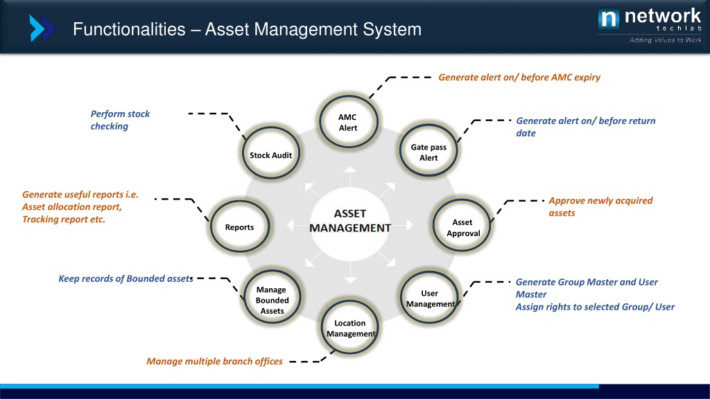5. Functionalities – Asset Management System • Generate alert on/ before AMC expiry Perform stock checking AMC Alert Generate alert on/ before return date Gate passAlert Stock Audit Generate useful reports i.e. Asset allocation report, Tracking report etc. Approve newly acquired assets Asset Approval Reports • Keep records of Bounded assets Generate Group Master and User Master Assign rights to selected Group/ User Manage BoundedAssets User Management Location Management Manage multiple branch offices