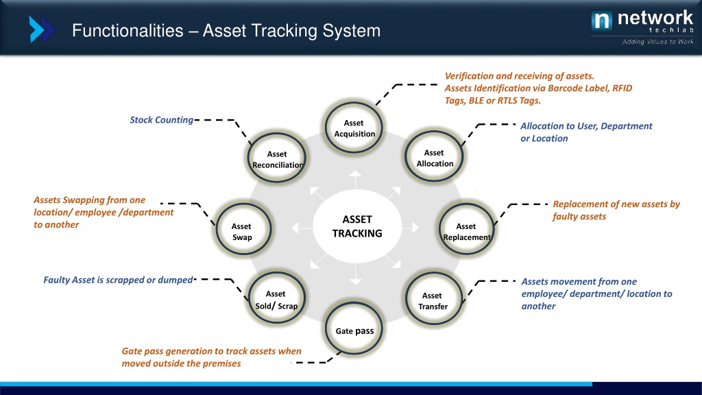 4. Functionalities – Asset Tracking System • Verification and receiving of assets. • Assets Identification via Barcode Label, RFID Tags, BLE or RTLS Tags. Stock Counting Asset Acquisition • Allocation to User, Department or Location Asset Allocation Asset Reconciliation ASSET TRACKING Assets Swapping from one location/ employee /department to another Replacement of new assets by faulty assets Asset Swap Asset Replacement • Faulty Asset is scrapped or dumped Assets movement from one employee/ department/ location to another Asset Sold/ Scrap Asset Transfer Gate pass Gate pass generation to track assets when moved outside the premises