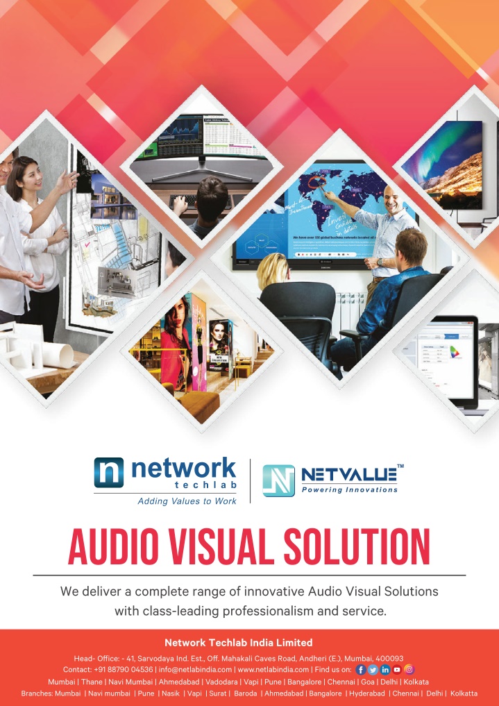 TM AUDIO VISUAL SOLUTION We deliver a complete range of innovative Audio Visual Solutions with class-leading professionalism and service. Network Techlab India Limited Head- Ofice: - 41, Sarvodaya Ind. Est., Of. Mahakali Caves Road, Andheri (E.), Mumbai, 400093 Contact: +91 88790 04536 | info@netlabindia.com | www.netlabindia.com | Find us on: Mumbai | Thane | Navi Mumbai | Ahmedabad | Vadodara | Vapi | Pune | Bangalore | Chennai | Goa | Delhi | Kolkata Branches: Mumbai | Navi mumbai | Pune | Nasik | Vapi | Surat | Baroda | Ahmedabad | Bangalore | Hyderabad | Chennai | Delhi | Kolkatta