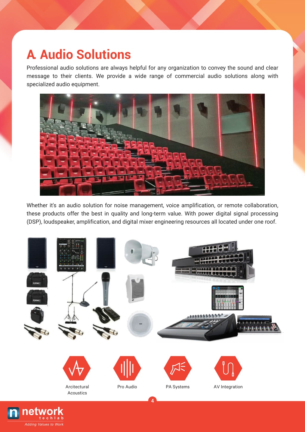 A. Audio Solutions Professional audio solutions are always helpful for any organization to convey the sound and clear message to their clients. We provide a wide range of commercial audio solutions along with specialized audio equipment. Whether it's an audio solution for noise management, voice amplification, or remote collaboration, these products offer the best in quality and long-term value. With power digital signal processing (DSP), loudspeaker, amplification, and digital mixer engineering resources all located under one roof. Arcitectural Acoustics Pro Audio PA Systems AV Integration 4