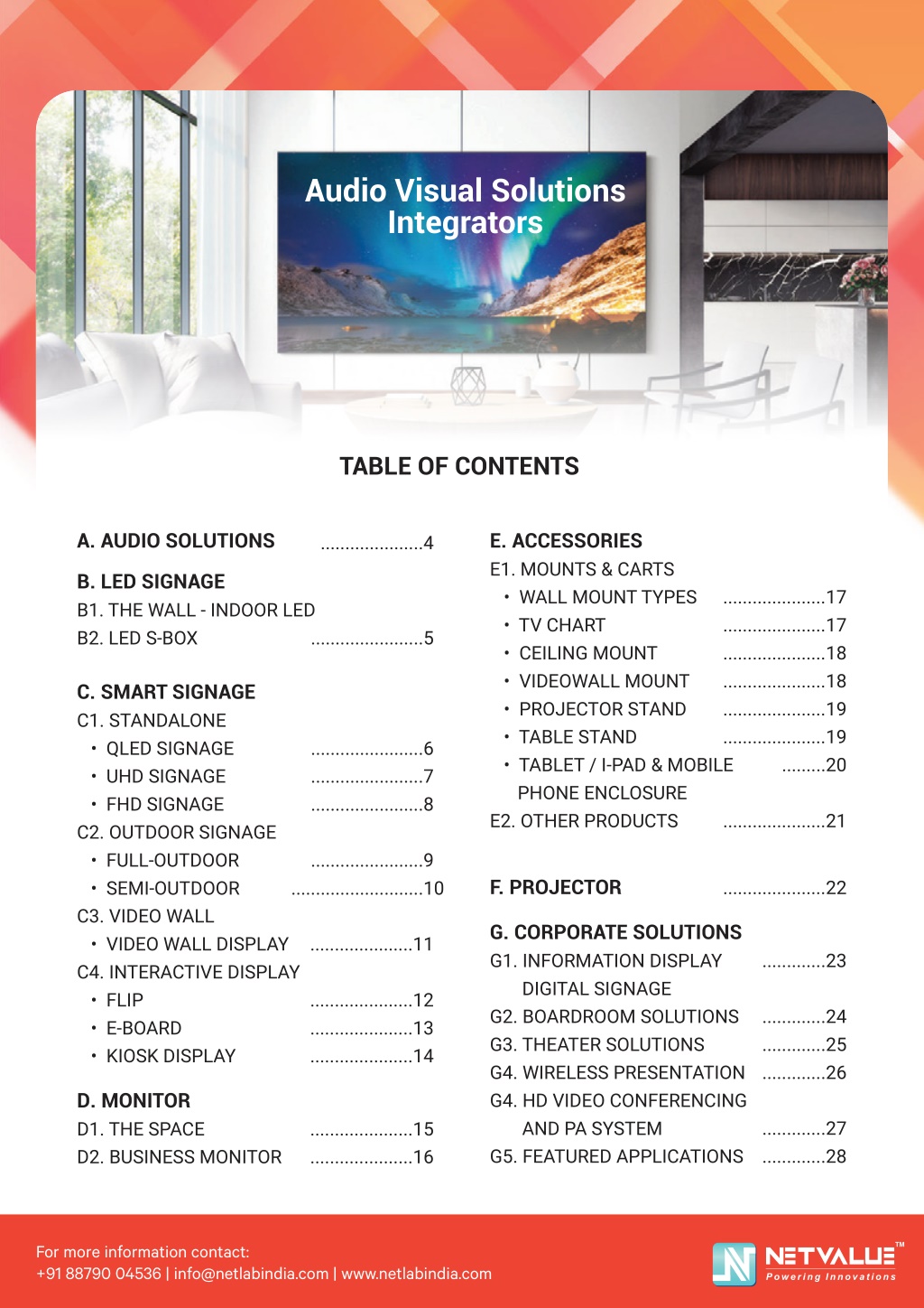 G. Corporate Solutions G1. Information Display Digital Signage Information display solutions (digital signage) have become an effective way to inform and communi- cate across the organization. Digital signage delivers specific and dynamic content to target audience. Features: • A Commercial-grade Display - Commercial-grade displays offer more durable hardware as compared to consumer-grade screens more common in homes. • Easy to Use Software - Digital signage software is used to create, edit, and publish the content that the audience is meant to see, interact with or on which to take action. • Engaging Content - An effective digital signage system needs to first grab the attention of the audience. • Dynamic Content Integrations - Dynamic content integrations make the digital signage solution effective in delivering relevant & engaging content in a timely, engaging, easily duplicable fashion. • Multi-screen Support - Environments where digital signage is being fully utilized are showcasing numerous multi-screen video layouts like video walls, large format LCD television screens, and even movie screen type displays. • Multi-user Access - Have access levels assigned to individuals or groups within the organization is essential, especially as the operator looks to scale their digital display network. 23 TM For more information contact: +91 88790 04536 | info@netlabindia.com | www.netlabindia.com