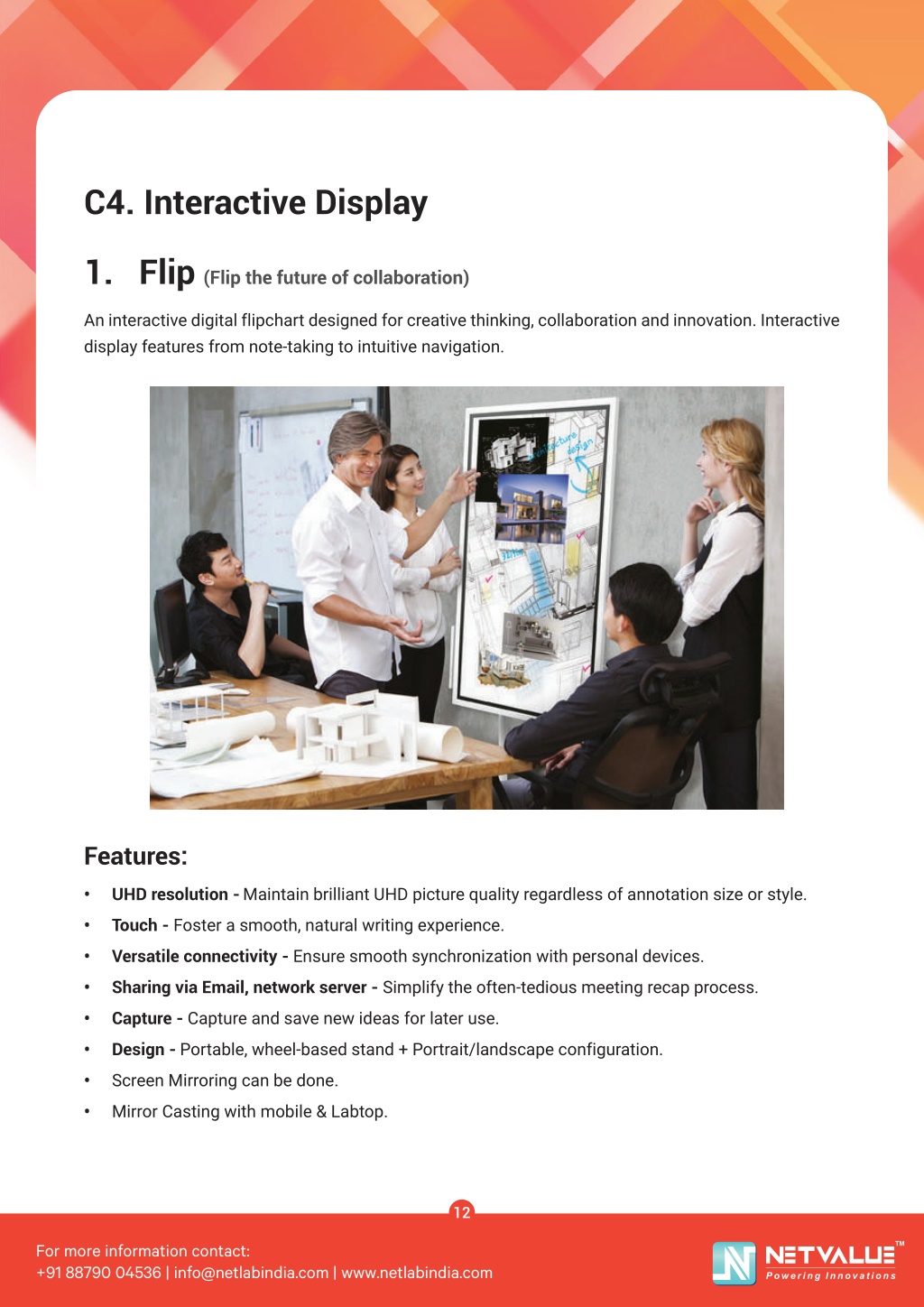 C4. Interactive Display 1. Flip (Flip the future of collaboration) An interactive digital flipchart designed for creative thinking, collaboration and innovation. Interactive display features from note-taking to intuitive navigation. Features: • UHD resolution - Maintain brilliant UHD picture quality regardless of annotation size or style. • Touch - Foster a smooth, natural writing experience. • Versatile connectivity - Ensure smooth synchronization with personal devices. • Sharing via Email, network server - Simplify the often-tedious meeting recap process. • Capture - Capture and save new ideas for later use. • Design - Portable, wheel-based stand + Portrait/landscape configuration. • Screen Mirroring can be done. • Mirror Casting with mobile & Labtop. 12 TM For more information contact: +91 88790 04536 | info@netlabindia.com | www.netlabindia.com