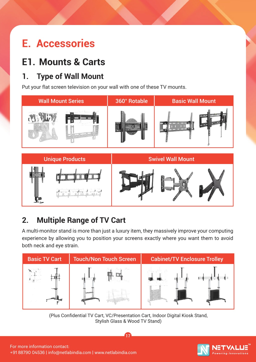 E. Accessories E1. Mounts & Carts 1. Type of Wall Mount Put your flat screen television on your wall with one of these TV mounts. Wall Mount Series 360° Rotable Basic Wall Mount Swivel Wall Mount Swivel Wall Mount Unique Products 2. Multiple Range of TV Cart A multi-monitor stand is more than just a luxury item, they massively improve your computing experience by allowing you to position your screens exactly where you want them to avoid both neck and eye strain. Basic TV Cart Touch/Non Touch Screen Cabinet/TV Enclosure Trolley (Plus Confidential TV Cart, VC/Presentation Cart, Indoor Digital Kiosk Stand, Stylish Glass & Wood TV Stand) 17 TM For more information contact: +91 88790 04536 | info@netlabindia.com | www.netlabindia.com