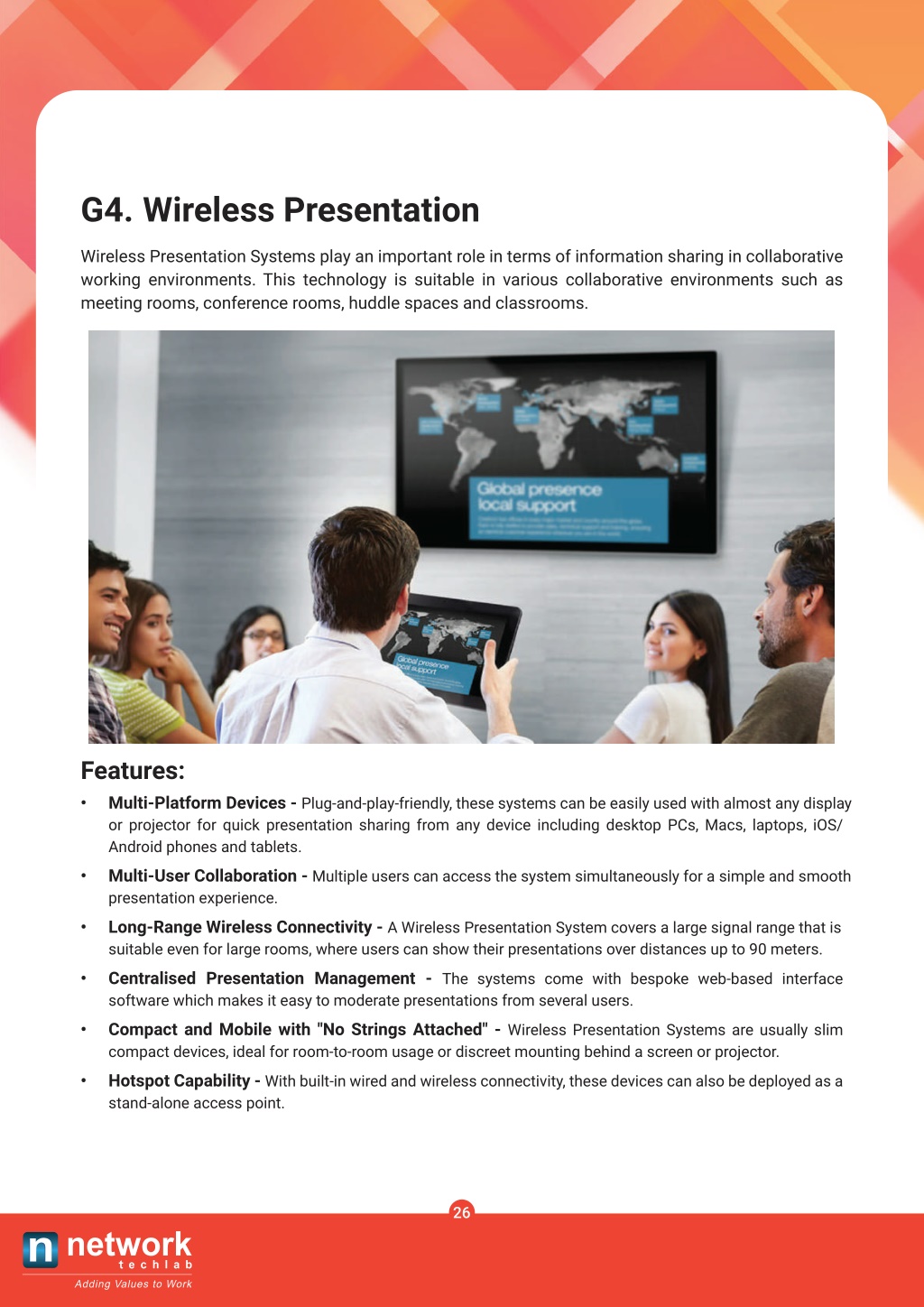 G4. Wireless Presentation Wireless Presentation Systems play an important role in terms of information sharing in collaborative working environments. This technology is suitable in various collaborative environments such as meeting rooms, conference rooms, huddle spaces and classrooms. Features: • Multi-Platform Devices - Plug-and-play-friendly, these systems can be easily used with almost any display or projector for quick presentation sharing from any device including desktop PCs, Macs, laptops, iOS/ Android phones and tablets. • Multi-User Collaboration - Multiple users can access the system simultaneously for a simple and smooth presentation experience. • Long-Range Wireless Connectivity - A Wireless Presentation System covers a large signal range that is suitable even for large rooms, where users can show their presentations over distances up to 90 meters. • Centralised Presentation Management - The systems come with bespoke web-based interface software which makes it easy to moderate presentations from several users. • Compact and Mobile with "No Strings Attached" - Wireless Presentation Systems are usually slim compact devices, ideal for room-to-room usage or discreet mounting behind a screen or projector. • Hotspot Capability - With built-in wired and wireless connectivity, these devices can also be deployed as a stand-alone access point. 26