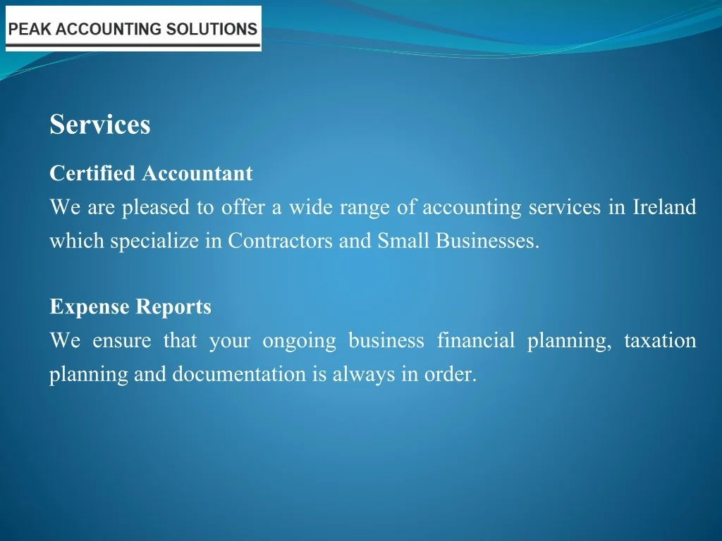 Services Certified Accountant We are pleased to offer a wide range of accounting services in Ireland which specialize in Contractors and Small Businesses. Expense Reports We ensure that your ongoing business financial planning, taxation planning and documentation is always in order.