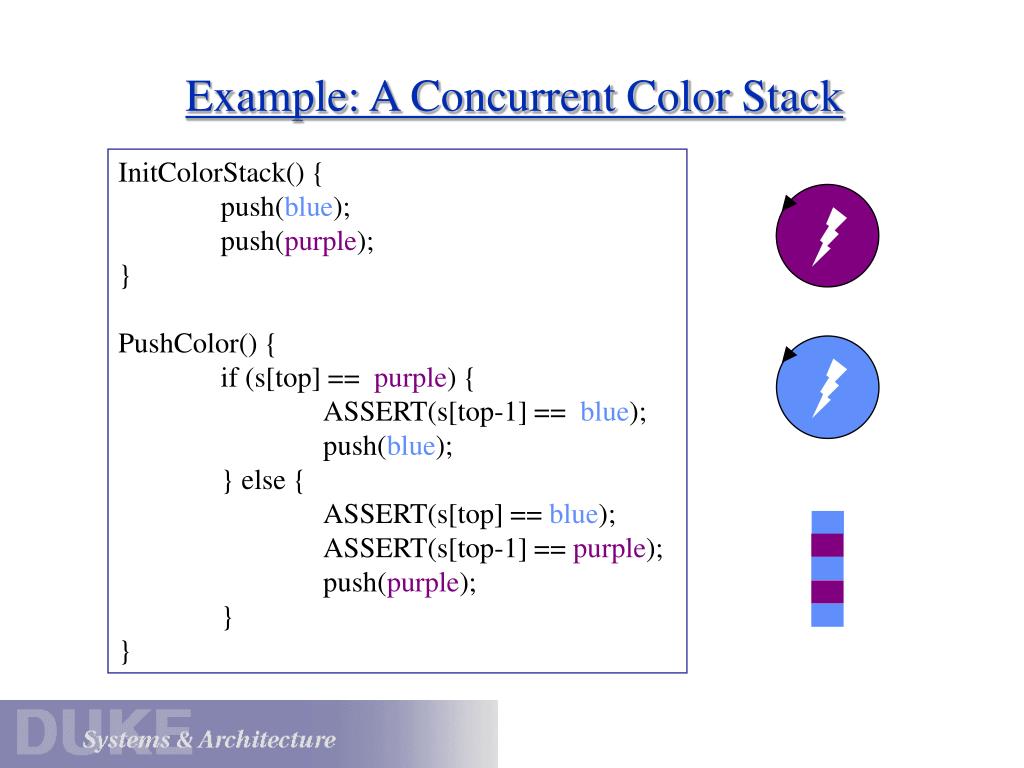 Example: A Concurrent Color Stack InitColorStack() { push(blue); push(purple); } PushColor() { if (s[top] == purple) { ASSERT(s[top-1] == blue); push(blue); } else { ASSERT(s[top] == blue); ASSERT(s[top-1] == purple); push(purple); } }
