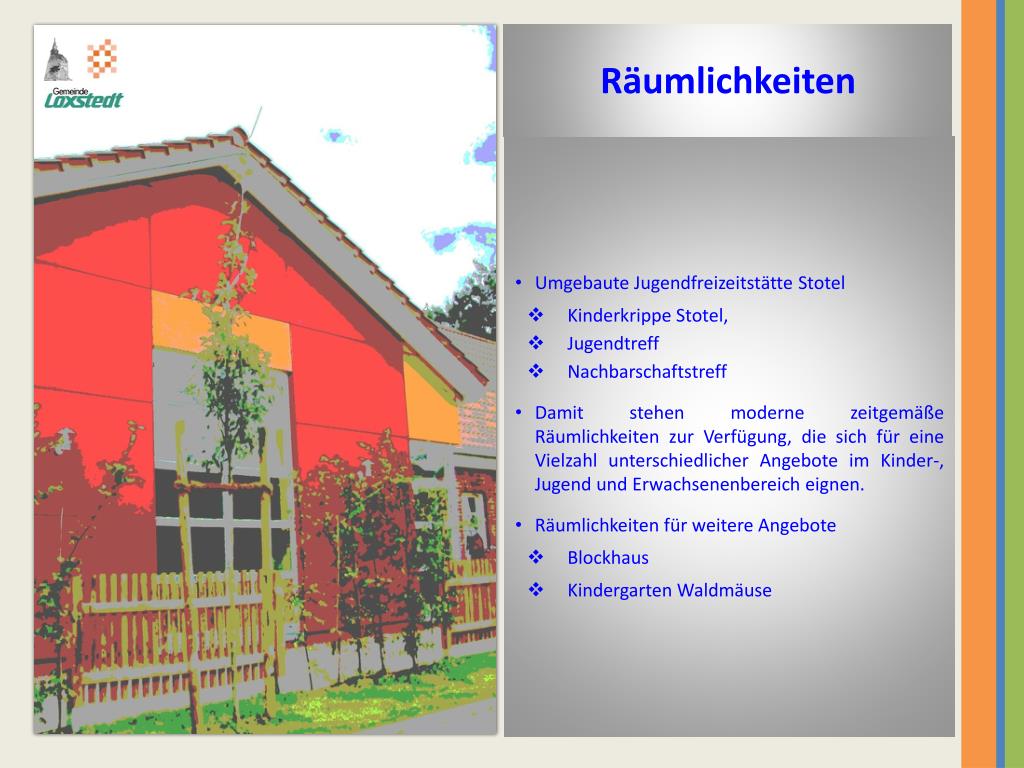 Räumlichkeiten • Umgebaute Jugendfreizeitstätte Stotel • Kinderkrippe Stotel, • Jugendtreff • Nachbarschaftstreff • Damit stehen moderne zeitgemäße Räumlichkeiten zur Verfügung, die sich für eine Vielzahl unterschiedlicher Angebote im Kinder-, Jugend und Erwachsenenbereich eignen. • Räumlichkeiten für weitere Angebote • Blockhaus • Kindergarten Waldmäuse
