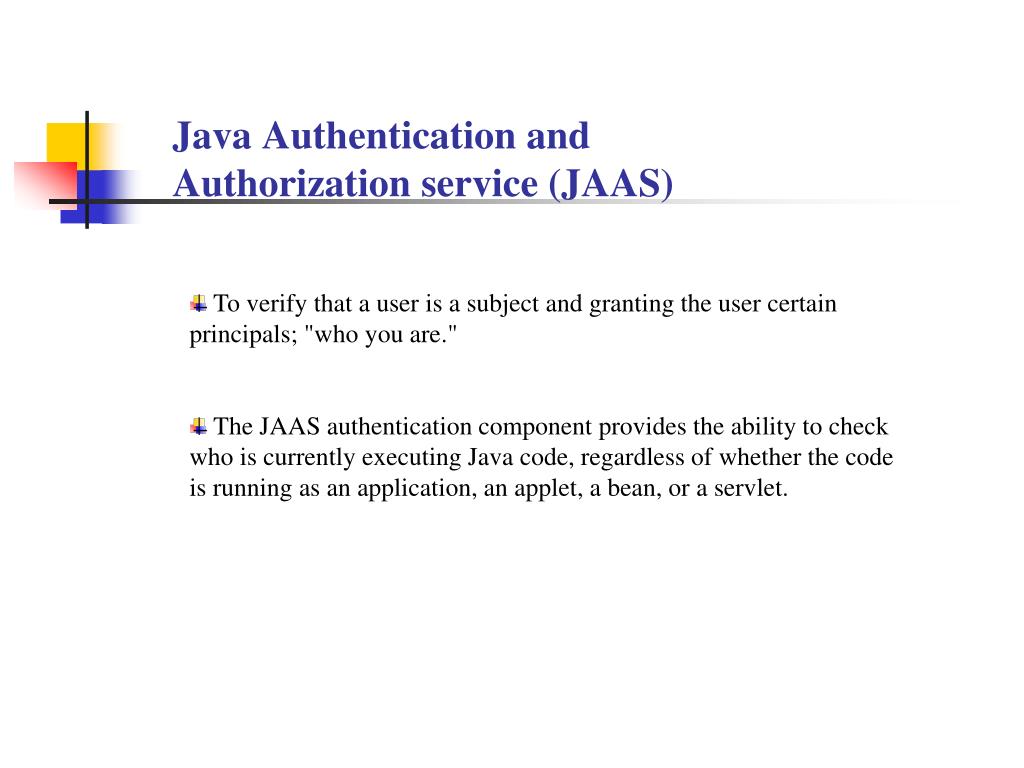 Java Authentication and Authorization service (JAAS) • To verify that a user is a subject and granting the user certain principals; "who you are." • The JAAS authentication component provides the ability to check who is currently executing Java code, regardless of whether the code is running as an application, an applet, a bean, or a servlet.