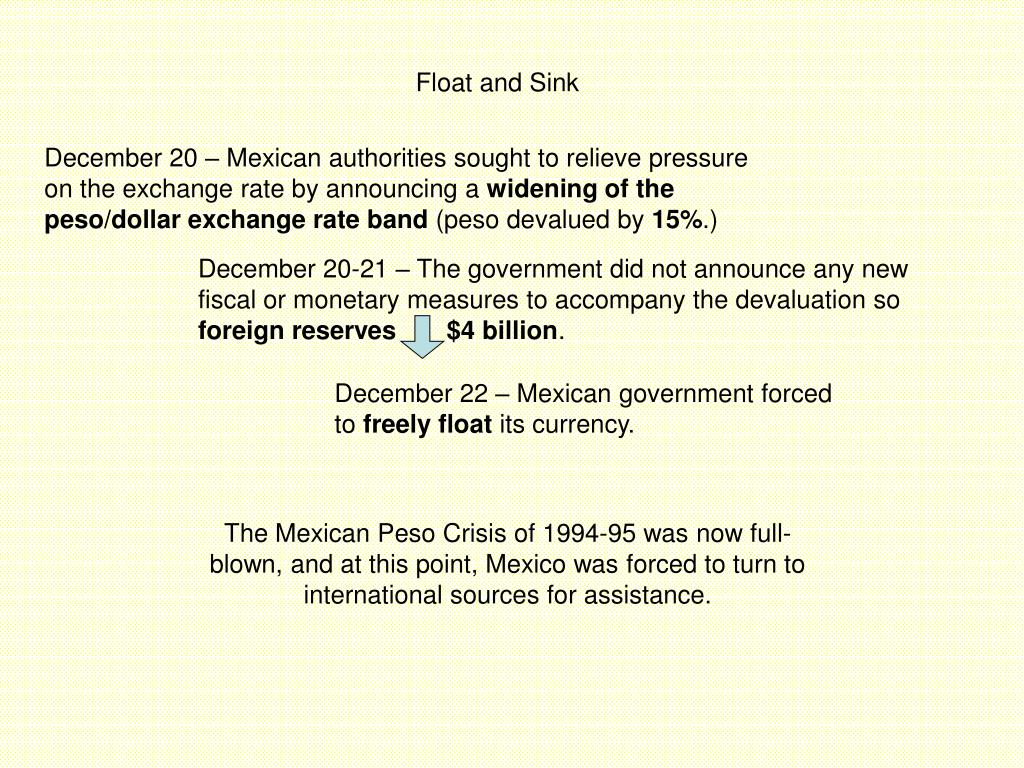 December 20-21 – The government did not announce any new fiscal or monetary measures to accompany the devaluation so foreign reserves $4 billion. Float and Sink December 20 – Mexican authorities sought to relieve pressure on the exchange rate by announcing a widening of the peso/dollar exchange rate band (peso devalued by 15%.) December 22 – Mexican government forced to freely float its currency. The Mexican Peso Crisis of 1994-95 was now full-blown, and at this point, Mexico was forced to turn to international sources for assistance.