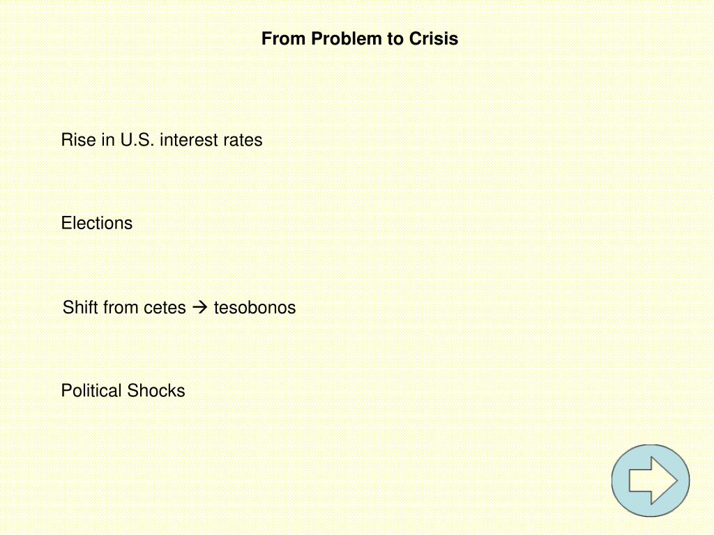 From Problem to Crisis Rise in U.S. interest rates Elections Shift from cetes tesobonos Political Shocks