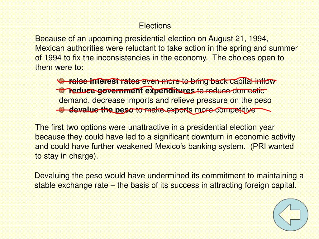Elections • Because of an upcoming presidential election on August 21, 1994, • Mexican authorities were reluctant to take action in the spring and summer of 1994 to fix the inconsistencies in the economy. The choices open to them were to: • raise interest rates even more to bring back capital inflow • reduce government expenditures to reduce domestic demand, decrease imports and relieve pressure on the peso • devalue the peso to make exports more competitive The first two options were unattractive in a presidential election year because they could have led to a significant downturn in economic activity and could have further weakened Mexico’s banking system. (PRI wanted to stay in charge). Devaluing the peso would have undermined its commitment to maintaining a stable exchange rate – the basis of its success in attracting foreign capital.