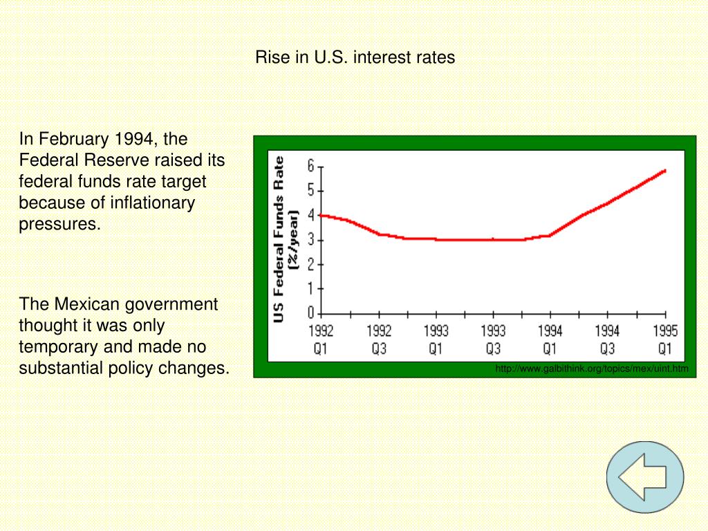 http://www.galbithink.org/topics/mex/uint.htm Rise in U.S. interest rates In February 1994, the Federal Reserve raised its federal funds rate target because of inflationary pressures. The Mexican government thought it was only temporary and made no substantial policy changes.