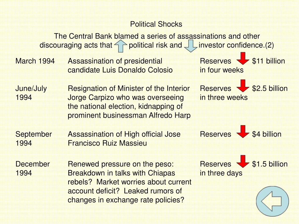 The Central Bank blamed a series of assassinations and other discouraging acts that political risk and investor confidence.(2) March 1994 Assassination of presidential candidate Luis Donaldo Colosio Reserves $11 billion in four weeks June/July 1994 Resignation of Minister of the Interior Jorge Carpizo who was overseeing the national election, kidnapping of prominent businessman Alfredo Harp Reserves $2.5 billion in three weeks September 1994 Assassination of High official Jose Francisco Ruiz Massieu Reserves $4 billion December 1994 Renewed pressure on the peso: Breakdown in talks with Chiapas rebels? Market worries about current account deficit? Leaked rumors of changes in exchange rate policies? Reserves $1.5 billion in three days Political Shocks