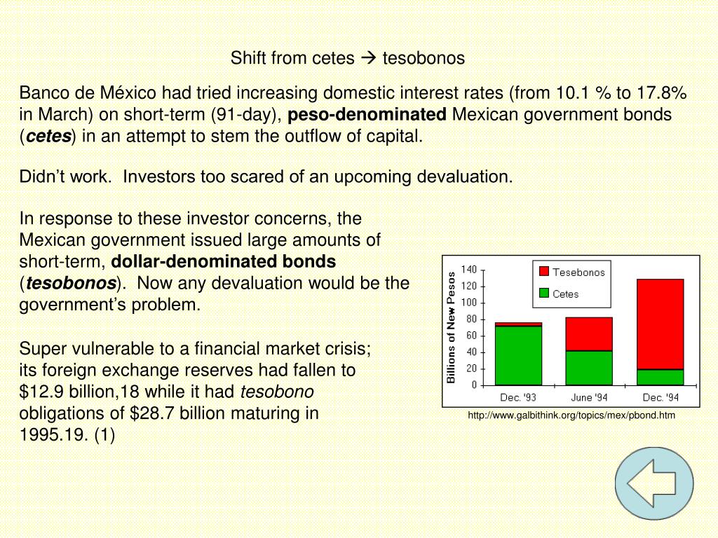 http://www.galbithink.org/topics/mex/pbond.htm Shift from cetes tesobonos Banco de México had tried increasing domestic interest rates (from 10.1 % to 17.8% in March) on short-term (91-day), peso-denominated Mexican government bonds (cetes) in an attempt to stem the outflow of capital. Didn’t work. Investors too scared of an upcoming devaluation. In response to these investor concerns, the Mexican government issued large amounts of short-term, dollar-denominated bonds (tesobonos). Now any devaluation would be the government’s problem. Super vulnerable to a financial market crisis; its foreign exchange reserves had fallen to $12.9 billion,18 while it had tesobono obligations of $28.7 billion maturing in 1995.19. (1)