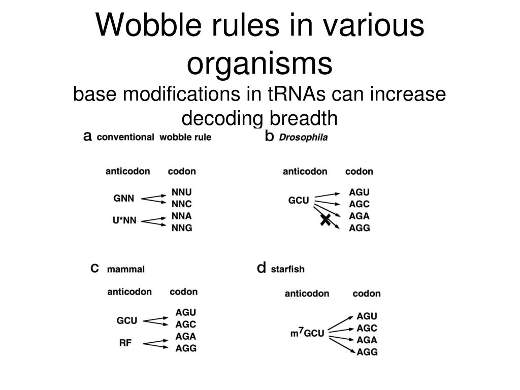 Wobble rules in various organismsbase modifications in tRNAs can increase decoding breadth